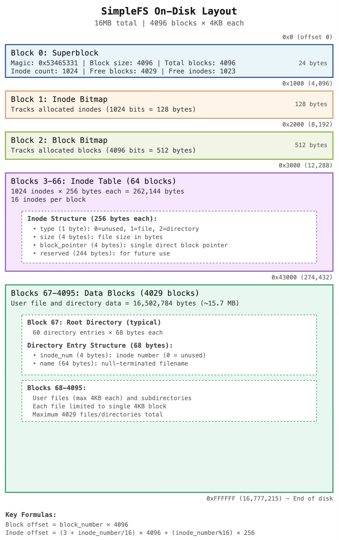 Every operating systems course teaches filesystems through textbooks. You study the theory: inodes store metadata, directory entries map names to inodes, bitmaps track free space. You might trace through ext4 or NTFS diagrams. But do you ever implement one yourself, watching the raw bytes take shape on disk?